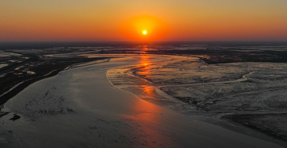 這是鹽城東臺條子泥濕地日落景色(9月1日攝,無人機(jī)照片)。