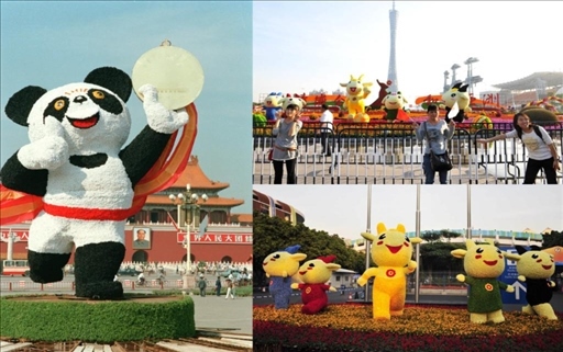 左圖:第11屆亞運(yùn)會(huì)吉祥物熊貓“盼盼”的造型;右上圖:人們?cè)诘?6屆亞運(yùn)會(huì)吉祥物“祥和如意樂洋洋”雕塑前拍照;右下圖:廣州亞運(yùn)會(huì)吉祥物造型花卉。資料照片