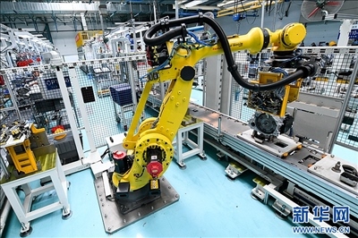 在位于哈爾濱市平房區(qū)哈爾濱東安汽車(chē)動(dòng)力股份有限公司生產(chǎn)車(chē)間,工業(yè)機(jī)器人在生產(chǎn)作業(yè)。