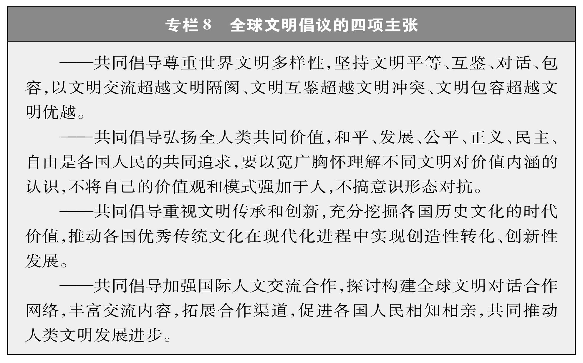 ——中國提出全球文明倡議,共同倡導(dǎo)尊重世界文明多樣性,共同倡導(dǎo)弘揚(yáng)全人類共同價(jià)值,共同倡導(dǎo)重視文明傳承和創(chuàng)新,共同倡導(dǎo)加強(qiáng)國際人文交流合作。全球文明倡議向全世界發(fā)出增進(jìn)文明交流對(duì)話、在包容互鑒中促進(jìn)人類文明進(jìn)步的真摯呼吁,為推動(dòng)構(gòu)建人類命運(yùn)共同體注入了精神動(dòng)力。