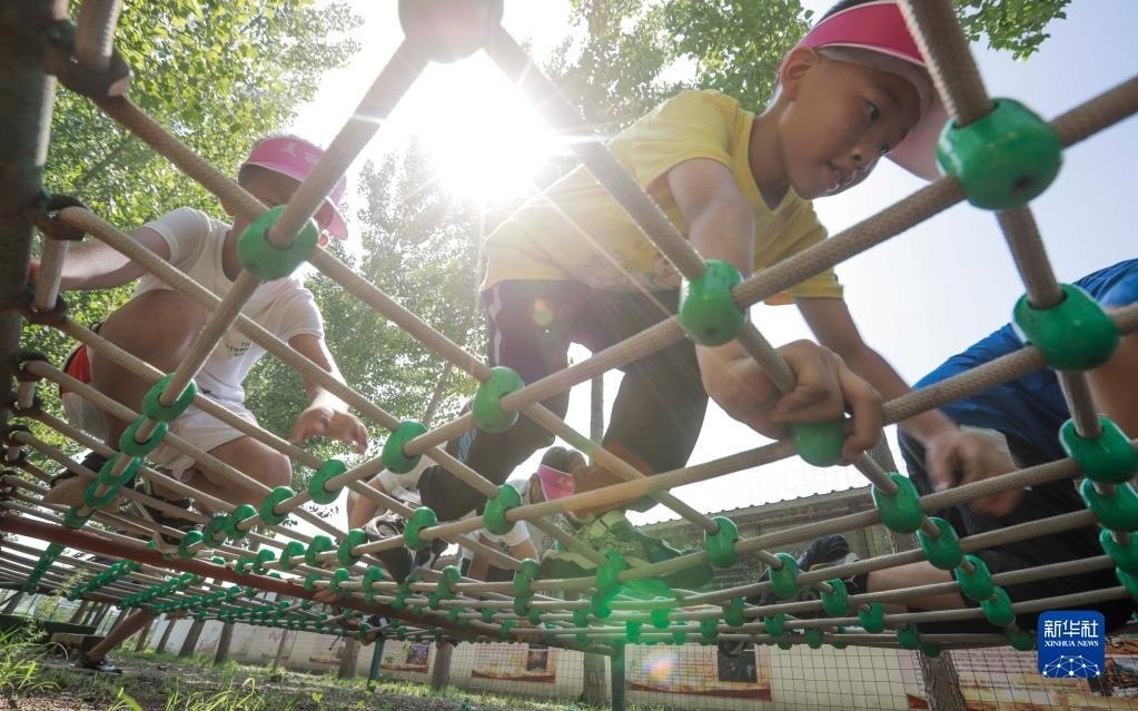 7月8日,參加少年夏令營的孩子在河北省遵化市小廠鄉(xiāng)的訓(xùn)練營地進行穿越障礙訓(xùn)練。