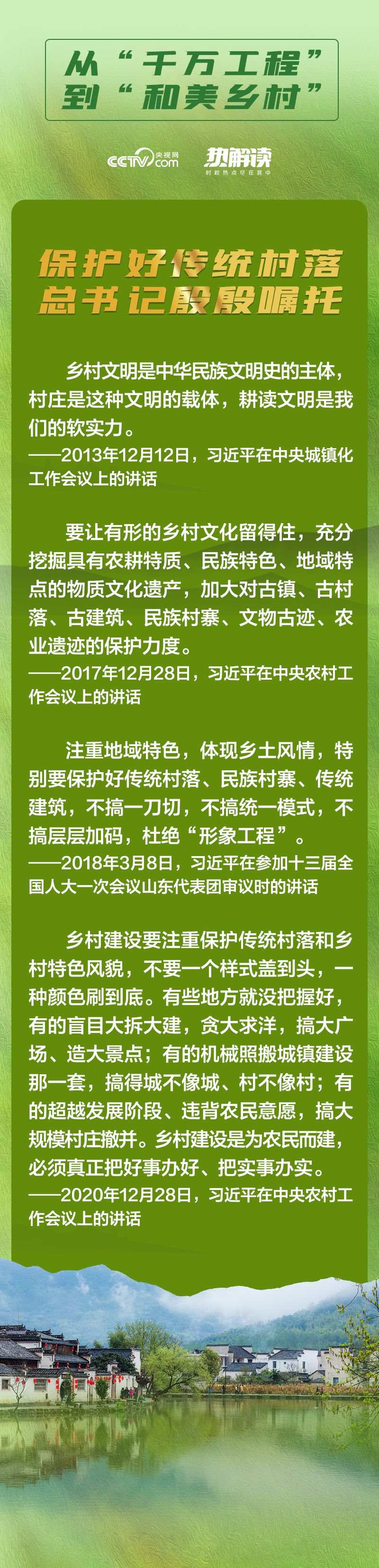 早在二十年前,時(shí)任浙江省委書記的習(xí)近平就在浙江省“千萬工程”啟動會上強(qiáng)調(diào),要正確處理保護(hù)歷史文化與村莊建設(shè)的關(guān)系,對有價(jià)值的古村落、古民居和山水風(fēng)光進(jìn)行保護(hù)、整治和科學(xué)合理地開發(fā)利用,切實(shí)保護(hù)好名人故居、古代建筑和歷史文化遺跡,做到傳承歷史文化與融入現(xiàn)代文明的有機(jī)統(tǒng)一。