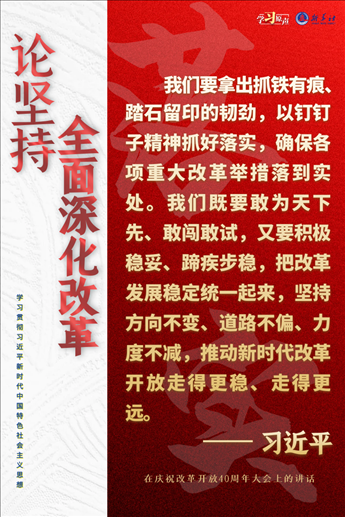 實(shí)現(xiàn)新時(shí)代新征程的目標(biāo)任務(wù),要把全面深化改革作為推進(jìn)中國式現(xiàn)代化的根本動(dòng)力,作為穩(wěn)大局、應(yīng)變局、開新局的重要抓手,把準(zhǔn)方向、守正創(chuàng)新、真抓實(shí)干,在新征程上譜寫改革開放新篇章。