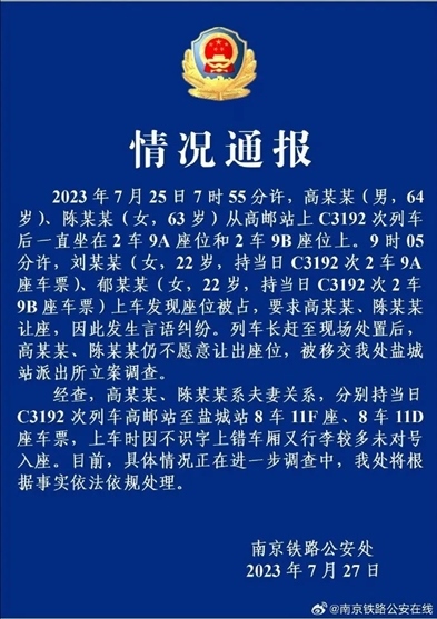 ·兩老人高鐵霸座反罵買票人不要臉,南京警方通報(bào)已立案調(diào)查。
