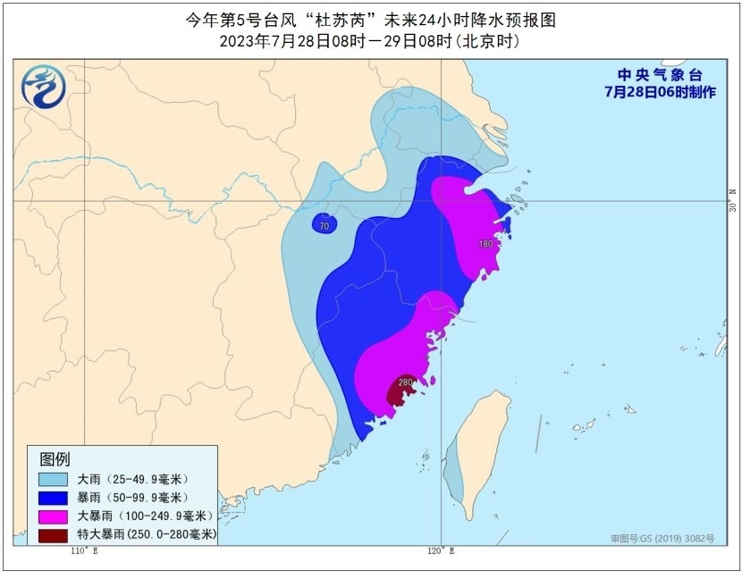 降水預(yù)報(bào):28日08時至29日08時,江蘇南部、安徽南部、浙江、福建、江西東部、臺灣島西南部等地的部分地區(qū)有大到暴雨,其中,浙江北部和東部、福建東部等地的部分地區(qū)有大暴雨,局地特大暴雨(250-280毫米)。