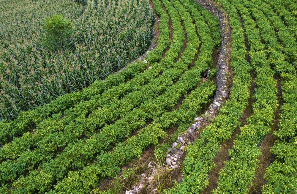 7月27日,一位村民在木者村“摸石谷”中建成的“三保”臺地上干農(nóng)活。新華社記者 楊植森 攝