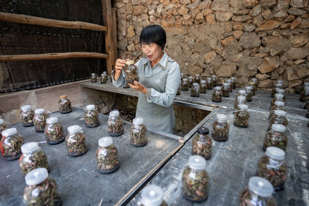 7月27日,謝成芬在家中搭建的大棚內(nèi)查看人工培養(yǎng)的金線蓮幼苗。新華社記者 陳欣波 攝