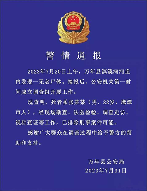 ·江西萬年警方再通報(bào)“河道發(fā)現(xiàn)無名尸體”:已排除刑事案件可能。