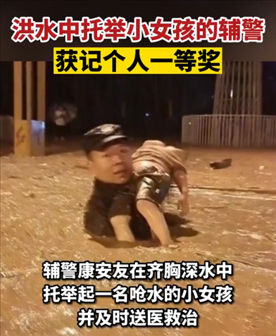 近日,四川瀘州古藺遭遇暴雨洪災(zāi)多人被困。輔警康安友在齊胸深水中托舉起一名嗆水的小女孩,并及時(shí)送醫(yī)救治。7月29日,康安友獲記個(gè)人一等獎(jiǎng)。