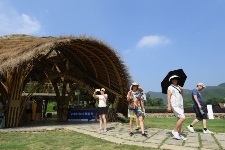 游客在安吉余村參觀用當(dāng)?shù)厥a(chǎn)的竹材料建造的建筑。圖片來源:新華社