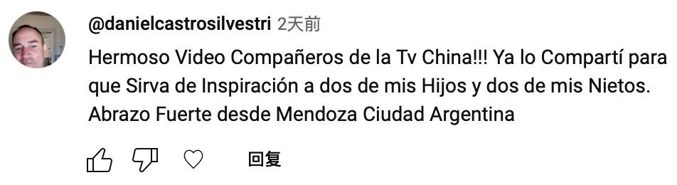 網友danielcastrosilvestri:“中國電視臺的朋友們,這個視頻太好看了?。。∥野阉窒沓鋈?,希望它能夠給我的兩個孩子和兩個孫子帶來啟發(fā)。我來自阿根廷的門多薩市,致禮。”