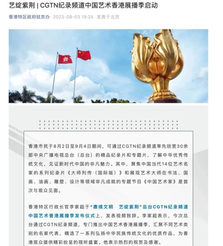 香港特區(qū)政府駐京辦刊文推介中國藝術香港展播季