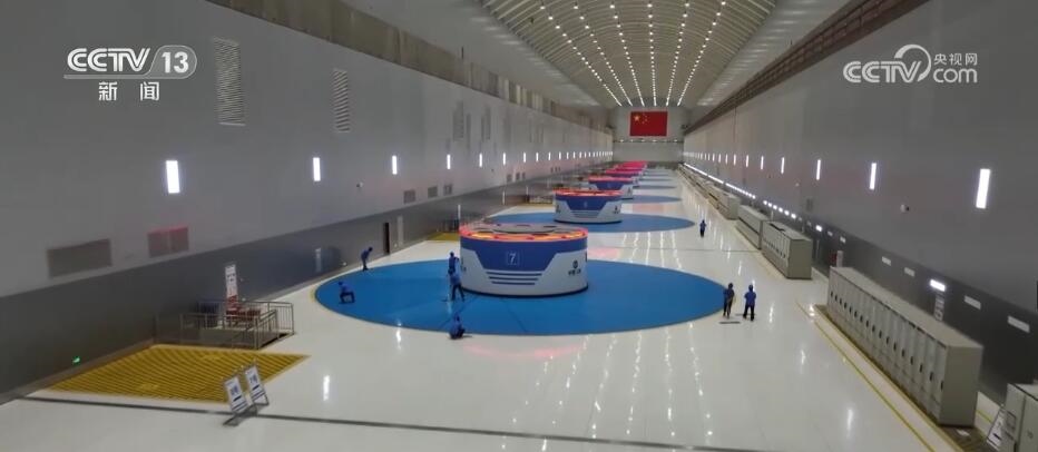 我現(xiàn)在就在白鶴灘水電站的左岸地下廠房,在我身后一字排開的,就是處于全發(fā)狀態(tài)當(dāng)中的百萬千瓦水輪發(fā)電機(jī)組。站在這兒,我其實(shí)只能看到它冒出地面的3米,而在我腳下還有51米,單臺(tái)機(jī)組的總重量接近8000噸。之所以讓它成為世界級的先進(jìn)的水輪發(fā)電機(jī)組,除了它的這種大體量和大功率之外,更重要的是在研發(fā)階段解決了許多世界級的難題。比如,它所克服的特殊工況下的壓力脈動(dòng),就能夠讓整臺(tái)機(jī)組在運(yùn)行的時(shí)候更加的安全、穩(wěn)定。再比如說,在機(jī)組高速運(yùn)轉(zhuǎn)的過程當(dāng)中,對于平穩(wěn)性的要求近乎于苛刻,我現(xiàn)在就站在機(jī)組的頂板上,在地面上立了幾枚硬幣,它們現(xiàn)在是穩(wěn)穩(wěn)地立在這兒,但是如果我輕輕的施加外力,它就會(huì)傾倒,看得出來它的平穩(wěn)性。而正是一代又一代的中國水電人的不斷努力,才實(shí)現(xiàn)了水輪發(fā)電機(jī)組從跟跑到并跑到超越的發(fā)展速度。鑄造出了這樣的國之重器。