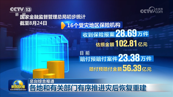 國家金融監(jiān)督管理總局初步統(tǒng)計(jì),截至8月24日,16個(gè)受災(zāi)地區(qū)保險(xiǎn)機(jī)構(gòu)收到保險(xiǎn)報(bào)案28.69萬件,估損金額102.81億元。目前賠付預(yù)賠付案件23.38萬件,賠付預(yù)賠付金額56.39億元。