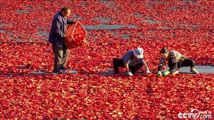 新疆巴音郭楞,博湖縣迎來辣椒豐收季,農(nóng)民們搶抓晴好天氣采摘、晾曬辣椒。