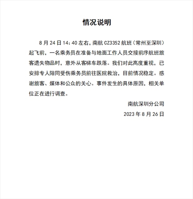 ·南航回應“空乘跌落”:傷者情況穩(wěn)定,具體原因正在調(diào)查。