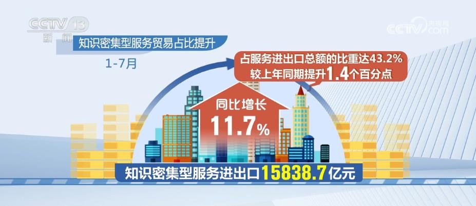 知識密集型服務貿易占比提升。1月—7月,知識密集型服務進出口15838.7億元,同比增長11.7%,占服務進出口總額的比重達43.2%,較上年同期提升1.4個百分點。