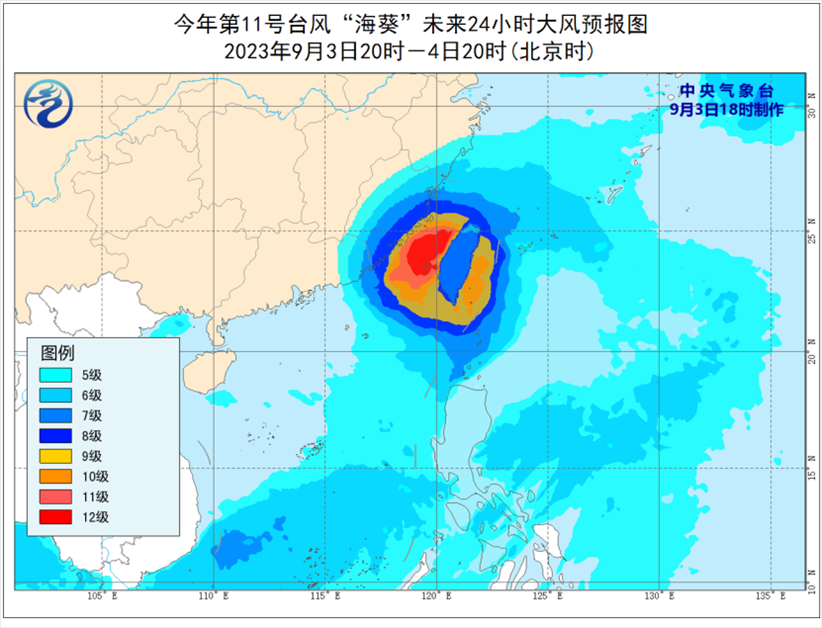 大風(fēng)預(yù)報(bào):9月3日20時(shí)至4日20時(shí),巴士海峽、臺灣海峽、臺灣以東洋面、東海南部及釣魚島附近海域、南海東北部以及浙江南部沿海、福建沿海、廣東東部偏東地區(qū)沿海、臺灣島及沿海將有6-8級、陣風(fēng)9-10級大風(fēng),部分海域或地區(qū)的風(fēng)力有9-12級,陣風(fēng)13-14級,“??敝行慕?jīng)過的附近海面或地區(qū)的風(fēng)力有13-14級,陣風(fēng)15級。