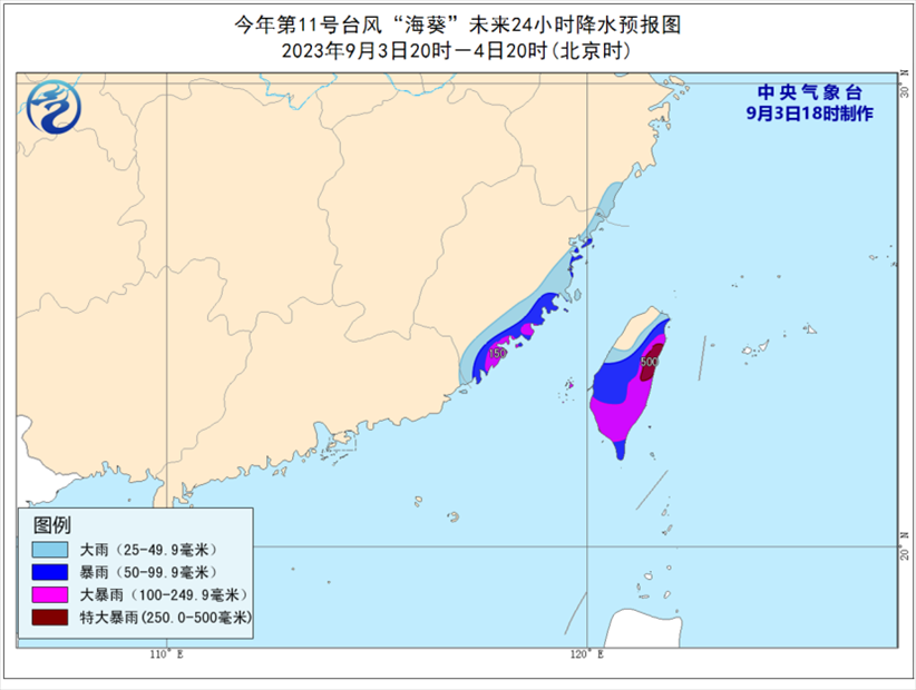 降水預(yù)報(bào):9月3日20時(shí)至4日20時(shí),福建東部、浙江東南部沿海、臺灣島等地有大到暴雨,其中,福建東南部沿海、臺灣島東部和南部等地部分地區(qū)有大暴雨,臺灣島東部局地特大暴雨(250~500毫米);上述地區(qū)最大小時(shí)降雨量20~50毫米,局地可超過60毫米,局地還有雷暴大風(fēng)等強(qiáng)對流天氣。