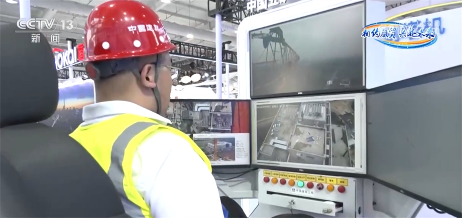 服貿(mào)會(huì)工作人員 趙晨曦:我現(xiàn)在控制的塔吊位于湖北省武漢市,距離展會(huì)現(xiàn)場(chǎng)1200公里?,F(xiàn)在我們來旋轉(zhuǎn)大臂,我們可以看到運(yùn)行過程非常流暢。接下來我們來落吊鉤,畫面也是幾乎沒有延遲。