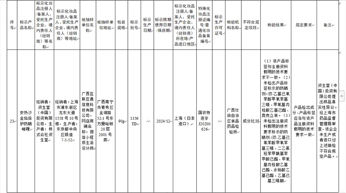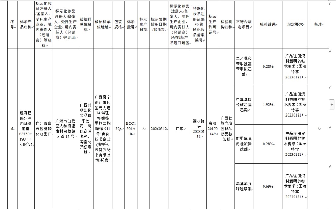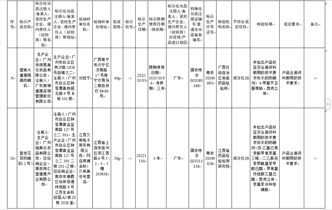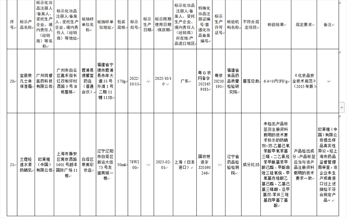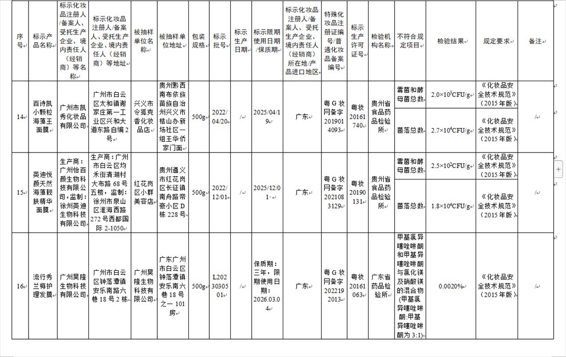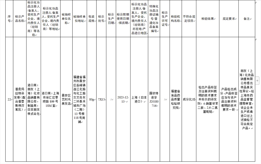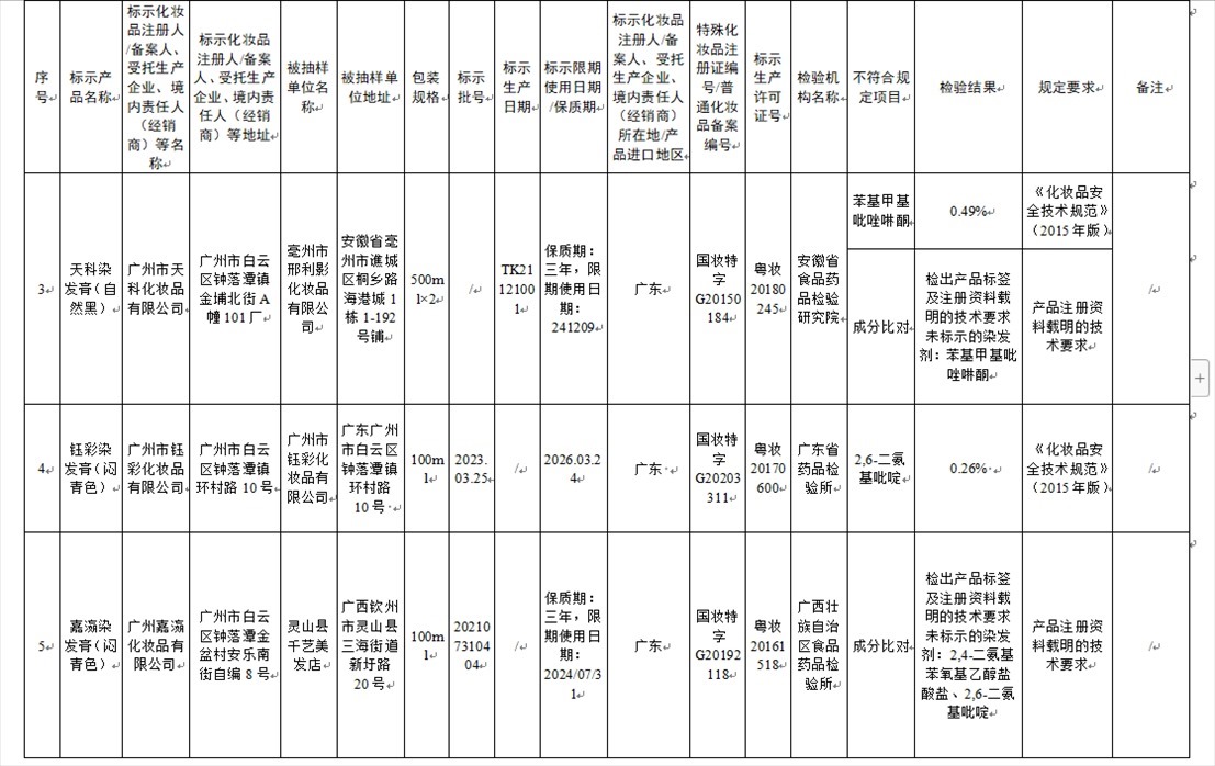 國家藥監(jiān)局網(wǎng)站今天發(fā)布通告稱,在2023年國家化妝品抽樣檢驗工作中,經(jīng)重慶市食品藥品檢驗檢測研究院等單位檢驗,產(chǎn)品標簽標示為廣州市天科化妝品有限公司生產(chǎn)的天科染發(fā)膏(自然黑)等23批次化妝品不符合規(guī)定(見下圖表格)。