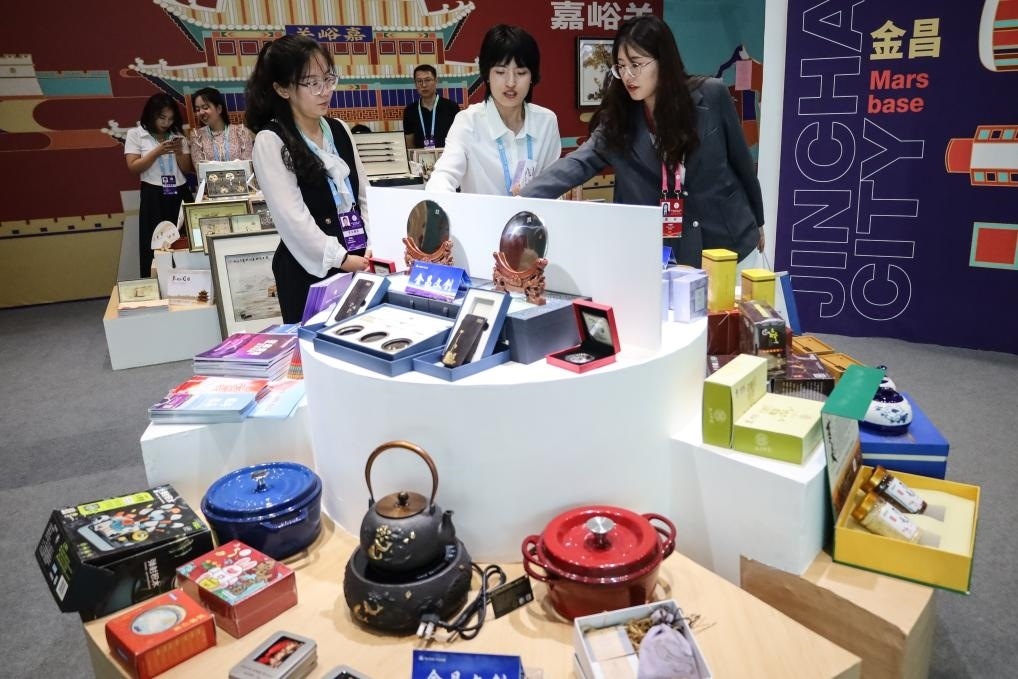 敦煌壁畫盲盒、幽幽鹿鳴小夜燈、三兔共悅彩繪果盤……6日,在文博會上的酒泉文創(chuàng)產(chǎn)品展臺,酒泉市文體廣電和旅游局工作人員王瑩說,“開館不到2小時就賣了近3000元,來購買文創(chuàng)的還有不少外國人。去年全年敦煌文創(chuàng)銷售額達4000多萬元?!?/p>