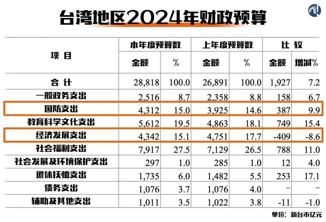 民進黨當局不久前通過的2024年財政預算案就很能說明問題。各項支出中,防務(wù)支出繼續(xù)保持增長,經(jīng)濟發(fā)展支出卻是所有領(lǐng)域中跌幅最大的。