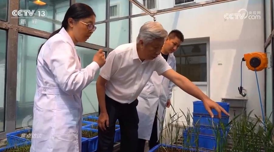 在河南省農(nóng)業(yè)科學(xué)院的玻璃溫室,50株剛剛破土一個月的小麥新品種幼苗長勢不錯。小麥品種的培育者——小麥育種專家許為鋼院士帶著團隊細心地查看這些幼苗。