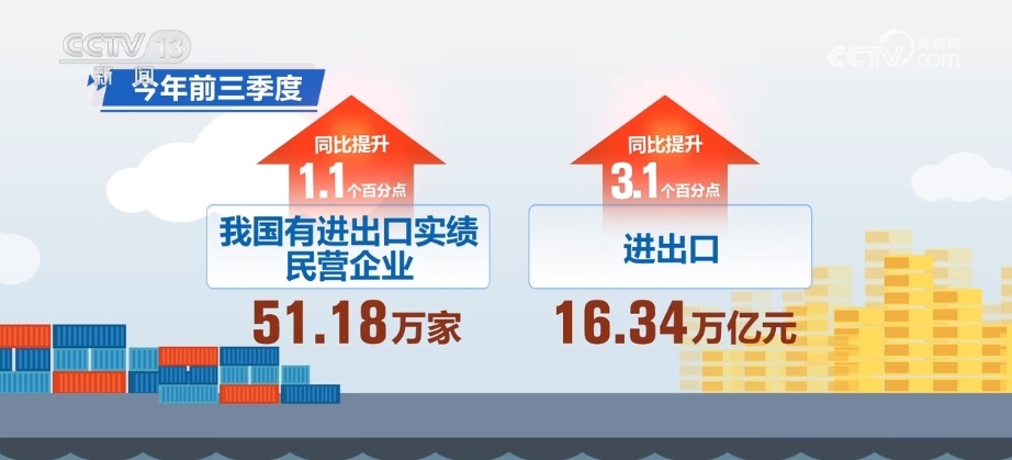 2023年前三季度,我國有進(jìn)出口實(shí)績(jī)的民營企業(yè)51.18萬家,進(jìn)出口16.34萬億元,分別占整體的85.7%、53.1%,同比分別提升1.1個(gè)、3.1個(gè)百分點(diǎn)。