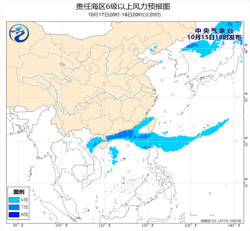 15日夜間至18日白天,臺灣海峽、臺灣以東洋面、巴士海峽、南海北部和中部海域、北部灣、瓊州海峽將有6~7級、陣風8~9級的偏北或東北風。