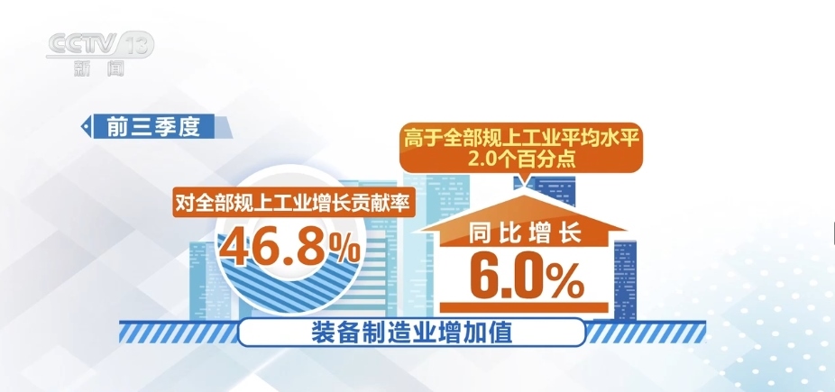 前三季度,在工業(yè)41個大類行業(yè)中,27個行業(yè)增加值實現(xiàn)增長,增長面達65.9%。其中,裝備制造業(yè)增加值同比增長6.0%,高于全部規(guī)上工業(yè)平均水平2.0個百分點,對全部規(guī)上工業(yè)增長貢獻率達46.8%。