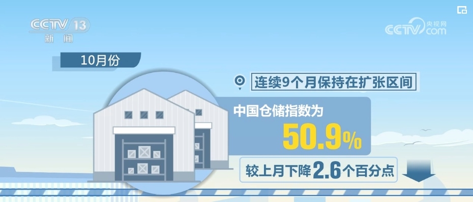 10月份,中國倉儲(chǔ)指數(shù)為50.9%,較上月下降2.6個(gè)百分點(diǎn),連續(xù)9個(gè)月保持在擴(kuò)張區(qū)間。