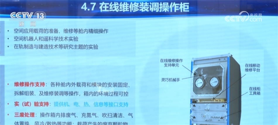 中國科學(xué)院空間應(yīng)用工程與技術(shù)中心研究員 張璐:其他的(實(shí)驗(yàn)柜)都屬于科學(xué)實(shí)驗(yàn)柜,都會(huì)有一個(gè)或者多個(gè)比較固定的研究主題。這個(gè)實(shí)驗(yàn)柜實(shí)際上更多的是一個(gè)支撐類的實(shí)驗(yàn)柜,它并沒有一個(gè)比如說像生命科學(xué)、流體科學(xué)這方面的專一的、獨(dú)立的一個(gè)研究方向。以前的時(shí)候,有些(設(shè)備)比如說壞了,航天員不是很方便地去進(jìn)行在軌的一些維修和更換。這個(gè)在線實(shí)際上就是指在軌的狀態(tài)下,航天員可以對其他的科學(xué)實(shí)驗(yàn)柜,包括其他的空間應(yīng)用系統(tǒng)的一些載荷裝置更換、維修,或者有操作需求的時(shí)候,這個(gè)實(shí)驗(yàn)柜提供了一系列包括結(jié)構(gòu)安裝、潔凈空間的處理,包括還有機(jī)械臂(手)的輔助操作,相應(yīng)的一些真空、排廢氣,很多工具類的支撐,來保障這些維修操作能夠在軌順利展開。