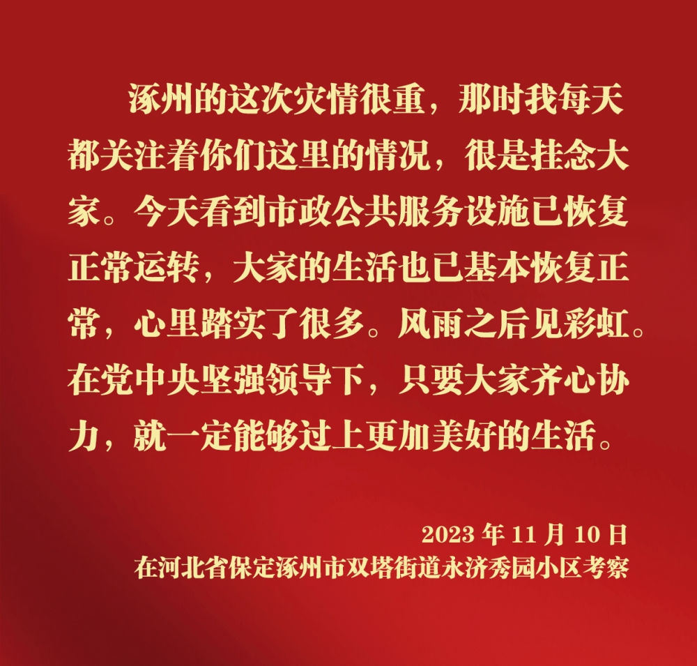 11月10日,中共中央總書記、國家主席、中央軍委主席習(xí)近平在北京、河北考察災(zāi)后恢復(fù)重建工作。他先后來到門頭溝、保定等地,實地了解災(zāi)后恢復(fù)重建情況。