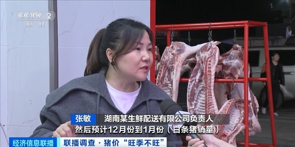 湖南某生鮮配送有限公司負責人 張敏:10月份到11月份(每天銷量)是450頭到600頭。預(yù)計12月份到1月份(白條豬銷量)會增長到一天800頭到1000頭。