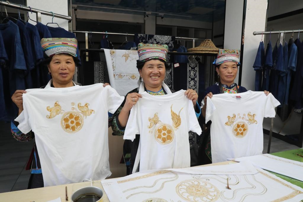 9月1日,苗族婦女姜老本(中)展示她和村民用蠟筆在T恤上畫的“村超”足球。(李長華 攝)