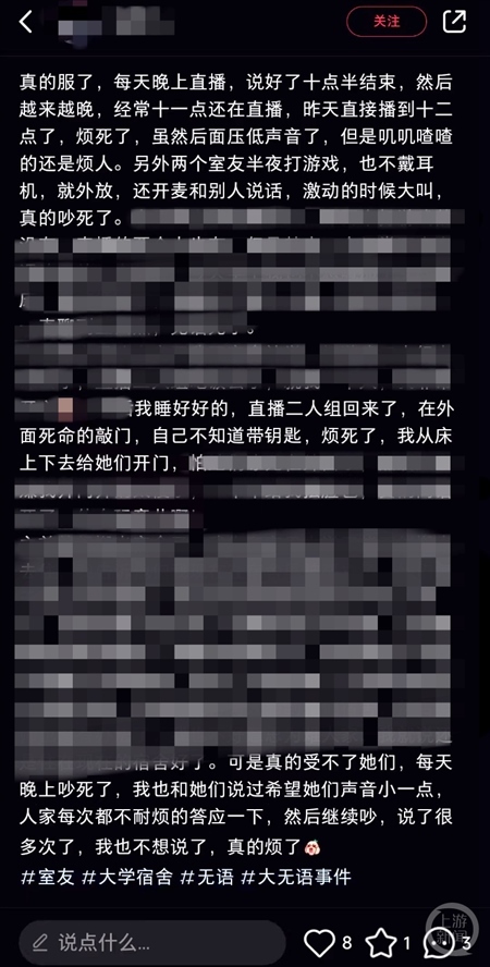 在某社交平臺搜索“室友在宿舍直播”,上游新聞記者發(fā)現(xiàn)超過50篇筆記都是有關(guān)大學(xué)生寢室直播引發(fā)室友不滿:“每天晚上吵死了,我也和她們說過希望她們聲音小一點(diǎn),人家每次都不耐煩地答應(yīng)一下,然后繼續(xù)吵”“我覺得在寢室直播就是不合適啊,但是想不到什么嚴(yán)肅有效的理由讓她不直播,求大家?guī)兔Τ鲋\劃策一下”……