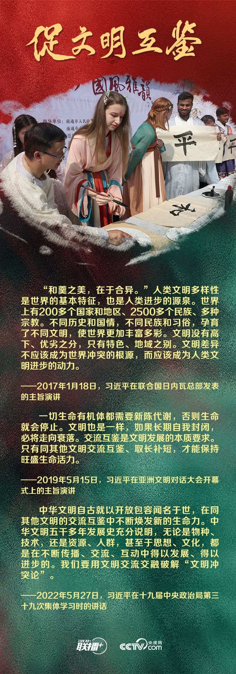 2023年3月15日,習近平主席在中國共產黨與世界政黨高層對話會上,提出了全球文明倡議。他指出,在各國前途命運緊密相連的今天,不同文明包容共存、交流互鑒,在推動人類社會現代化進程、繁榮世界文明百花園中具有不可替代的作用。