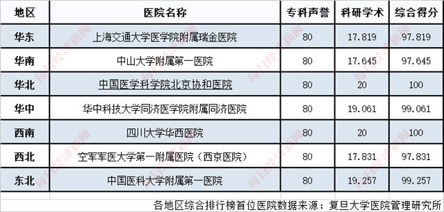 分地區(qū)看,中國(guó)醫(yī)學(xué)科學(xué)院北京協(xié)和醫(yī)院和四川大學(xué)華西醫(yī)院分別以??坡曌u(yù)(80)、科研學(xué)術(shù)(20)雙滿分的成績(jī)領(lǐng)跑華北地區(qū)、西南地區(qū)的綜合排行榜,中國(guó)醫(yī)科大學(xué)附屬第一醫(yī)院和華中科技大學(xué)同濟(jì)醫(yī)學(xué)院附屬同濟(jì)醫(yī)院則分別以99.257和99.061的成績(jī)領(lǐng)跑東北地區(qū)和華中地區(qū)。此外,上海交通大學(xué)醫(yī)學(xué)院附屬瑞金醫(yī)院、中山大學(xué)附屬第一醫(yī)院、空軍軍醫(yī)大學(xué)第一附屬醫(yī)院(西京醫(yī)院)也分別在各地區(qū)的綜合排行榜中位列首位。