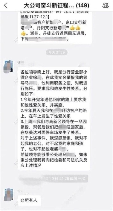 ·江蘇銀行鎮(zhèn)江分行回應女員工舉報被領(lǐng)導施壓發(fā)生性關(guān)系:已免去馬某團隊經(jīng)理職務。