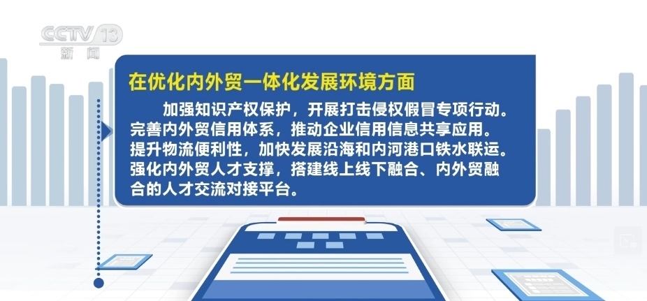 在優(yōu)化內外貿(mào)一體化發(fā)展環(huán)境方面,加強知識產(chǎn)權保護,開展打擊侵權假冒專項行動。完善內外貿(mào)信用體系,推動企業(yè)信用信息共享應用。提升物流便利性,加快發(fā)展沿海和內河港口鐵水聯(lián)運。強化內外貿(mào)人才支撐,搭建線上線下融合、內外貿(mào)融合的人才交流對接平臺。