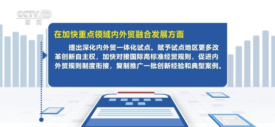 在加快重點領域內外貿(mào)融合發(fā)展方面,提出深化內外貿(mào)一體化試點。賦予試點地區(qū)更多改革創(chuàng)新自主權,加快對接國際高標準經(jīng)貿(mào)規(guī)則,促進內外貿(mào)規(guī)則制度銜接,復制推廣一批創(chuàng)新經(jīng)驗和典型案例。