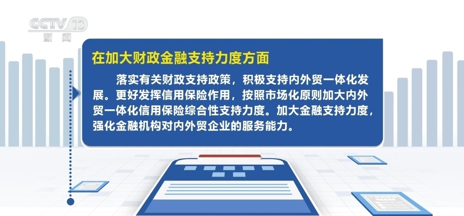 在加大財政金融支持力度方面,落實有關財政支持政策,積極支持內外貿(mào)一體化發(fā)展。更好發(fā)揮信用保險作用,按照市場化原則加大內外貿(mào)一體化信用保險綜合性支持力度。加大金融支持力度,強化金融機構對內外貿(mào)企業(yè)的服務能力。