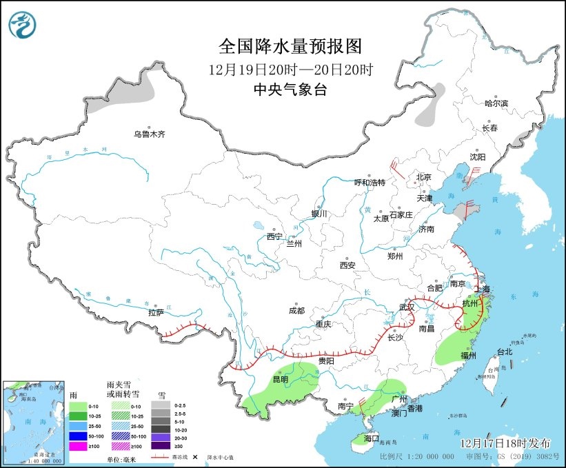 圖6 全國降水量預(yù)報(bào)圖(12月19日20時-20日20時)
