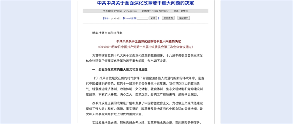 2013年11月,黨的十八屆三中全會通過由習(xí)近平總書記親自主持起草的《中共中央關(guān)于全面深化改革若干重大問題的決定》。《決定》首次提出全面深化改革的總目標(biāo)——完善和發(fā)展中國特色社會主義制度,推進國家治理體系和治理能力現(xiàn)代化。