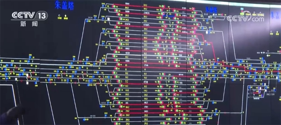 總臺央視記者 張叢婧:我現在是來到了車站的行車指揮室,可以看到這塊大屏幕上實時顯示著車站的列車狀態(tài),中間這些紅色的線就代表著此時軌道上正在有列車作業(yè)或者等待作業(yè),左邊這些紅色線就意味著現在有列車正在進站。