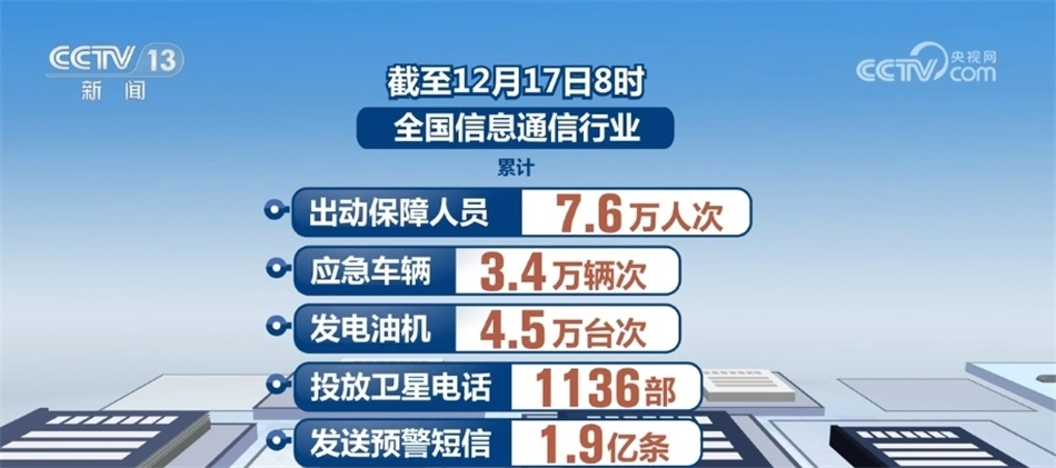據(jù)了解,截至12月17日8時(shí),全國(guó)信息通信行業(yè)累計(jì)出動(dòng)保障人員7.6萬人次、應(yīng)急車輛3.4萬輛次、發(fā)電油機(jī)4.5萬臺(tái)次、投放衛(wèi)星電話1136部、發(fā)送預(yù)警短信1.9億條。全國(guó)通信網(wǎng)絡(luò)整體運(yùn)行平穩(wěn),累計(jì)3053座基站退服,已修復(fù)2933座,未發(fā)生鄉(xiāng)鎮(zhèn)級(jí)通信全阻。