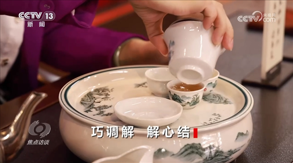 朱桂曼:“在調(diào)解過程中,我一邊給他們泡茶,一邊了解雙方當(dāng)事人的立場和訴求,把握‘茶水均勻分配’的老規(guī)矩,不偏不倚,公正公平,結(jié)合講法講理講情,把握分寸,適度調(diào)解。就像我們泡茶時講究‘茶水七八分’,避免‘茶滿欺客’,矛盾激化。我勸兩位鄰居互相讓一讓,換位思考一下,鄰里之間以和為貴,低頭不見抬頭見?!?/p>