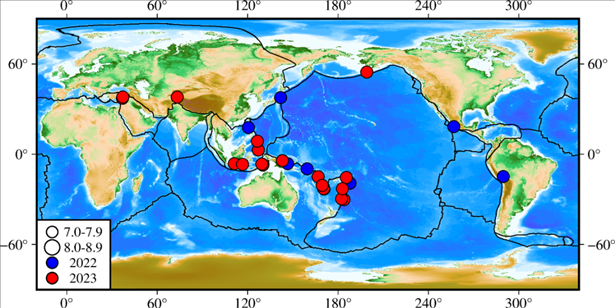 2023年95%的全球7級以上地震發(fā)生在歐亞地震帶和澳大利亞板塊東北邊界。其中歐亞地震帶發(fā)生7級以上地震7次,澳大利亞板塊東北邊界發(fā)生7級以上地震11次。