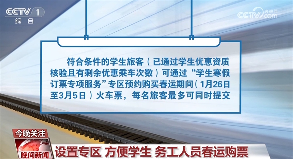 此外,符合條件的學(xué)生旅客(已通過(guò)學(xué)生優(yōu)惠資質(zhì)核驗(yàn)且有剩余優(yōu)惠乘車次數(shù))可通過(guò)“學(xué)生寒假訂票專項(xiàng)服務(wù)”專區(qū)預(yù)約購(gòu)買春運(yùn)期間(1月26日至3月5日)火車票,每名旅客最多可同時(shí)提交6個(gè)預(yù)約訂單,每個(gè)訂單可添加1個(gè)乘車日期的20個(gè)“車次+席別”的組合,可選席別為學(xué)生優(yōu)惠票適用的硬座、硬臥、二等座。